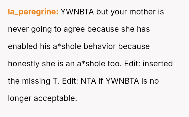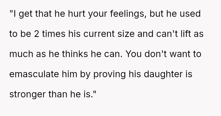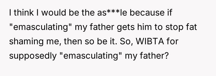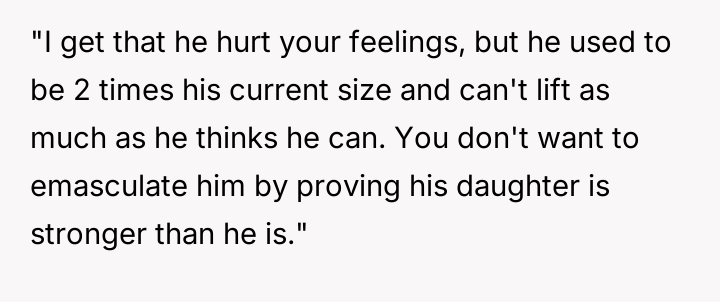 The central question remains whether OP is justified in prioritizing her emotional well-being and demanding an end to the a**se, even if the m**hod—proving physical superiority to her father—risks damaging his self-perception, or if protecting his sense of masculinity should take precedence over stopping the hurtful behavior.