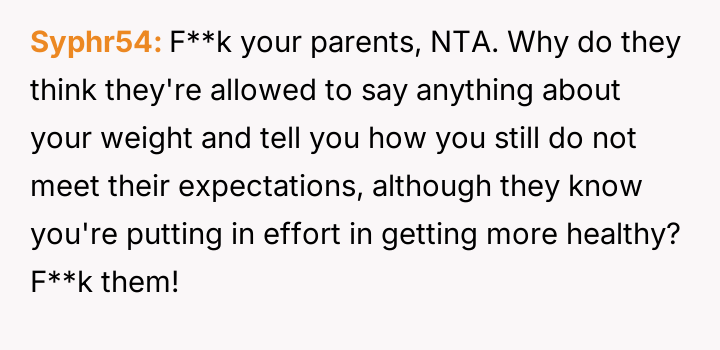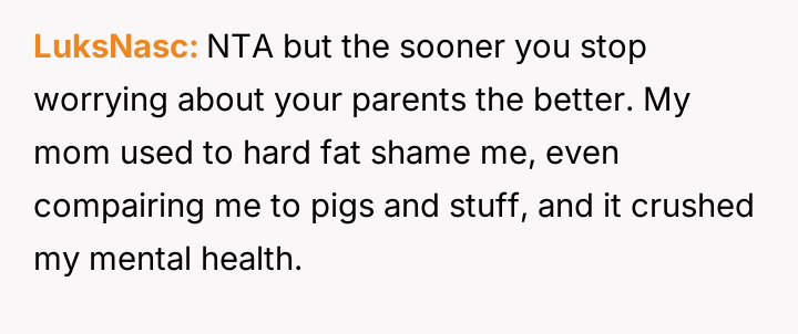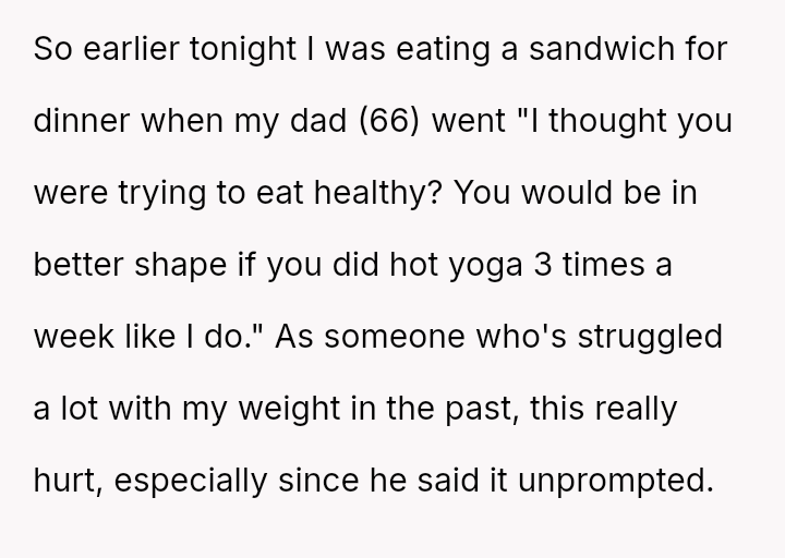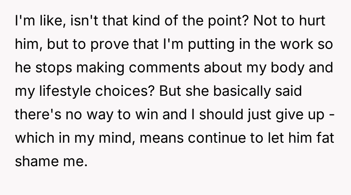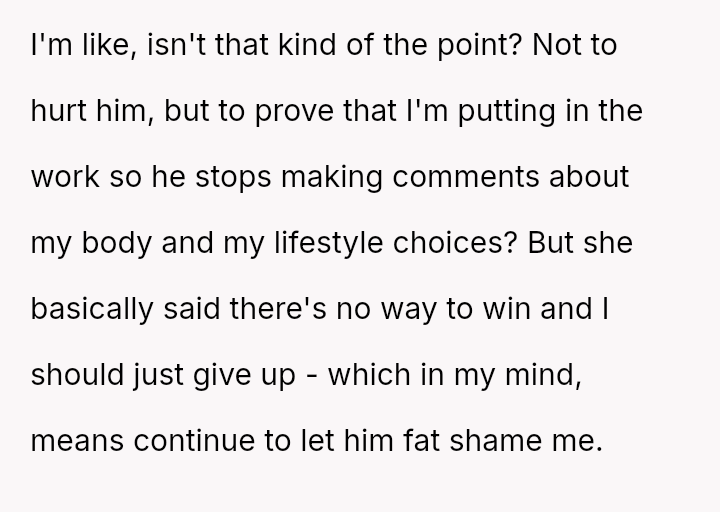 The original poster (OP) is facing emotional distress due to persistent fat-shaming comments from her father, which her mother supports by discouraging confrontation.