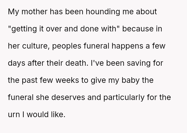 The central conflict arises from the OP's need to process their loss at their own pace clashing directly with the mother's urgent cultural expectation to finalize the burial arrangements quickly.
