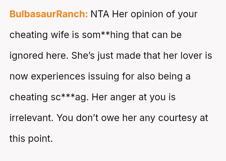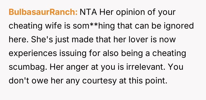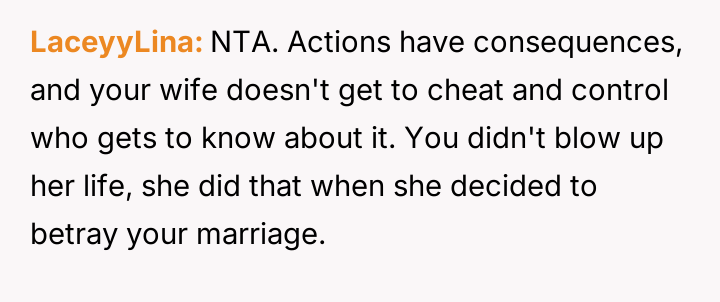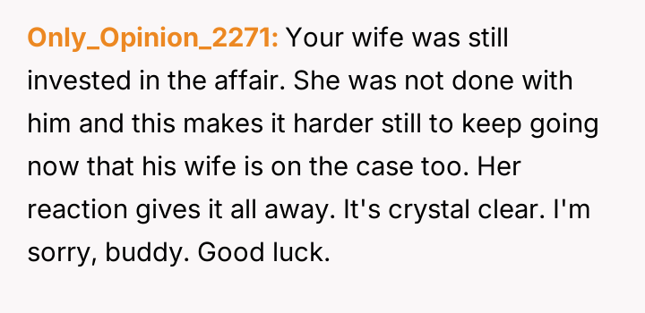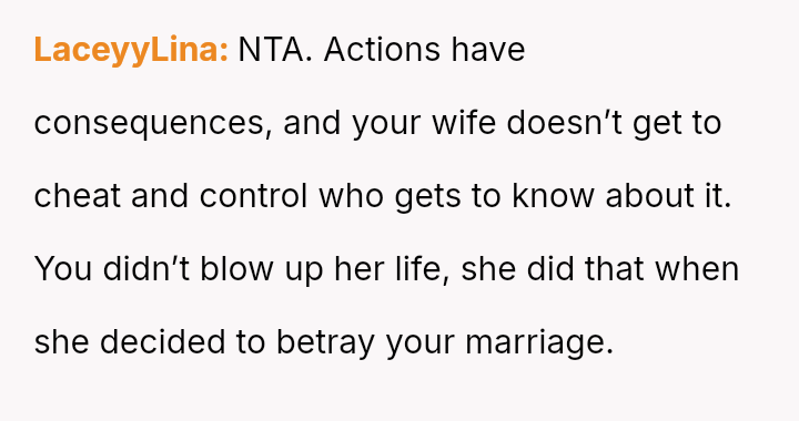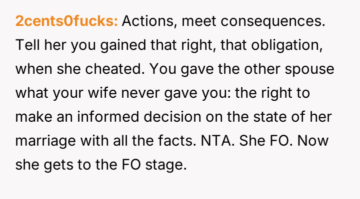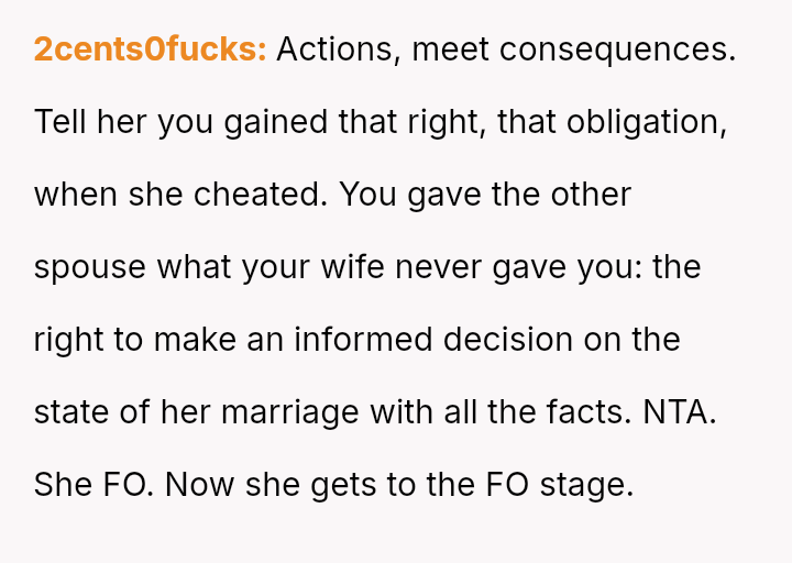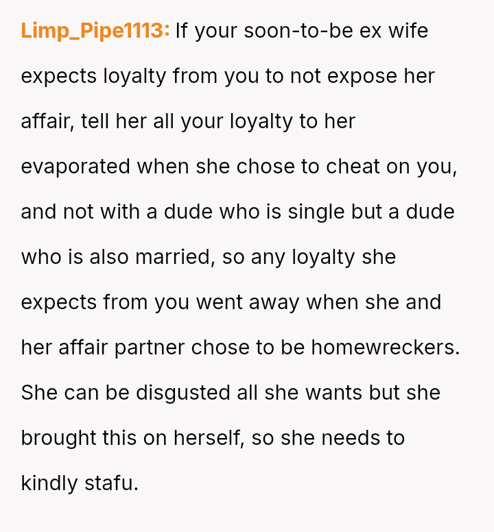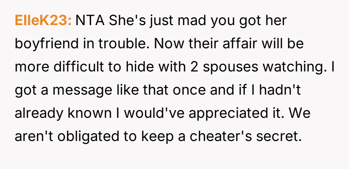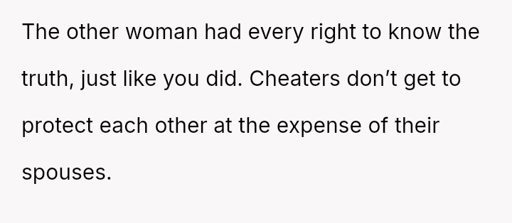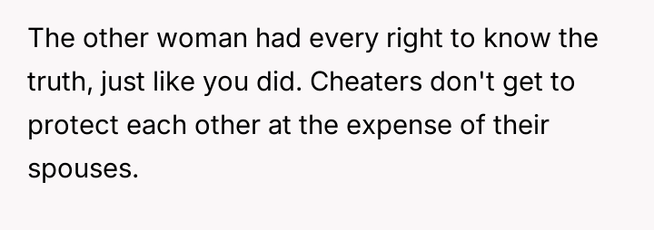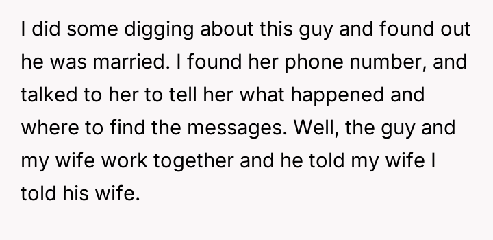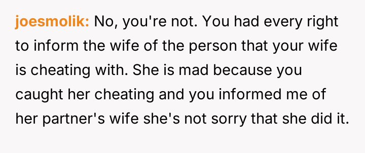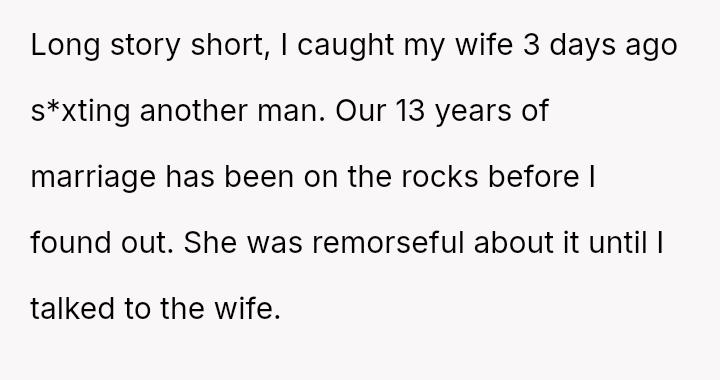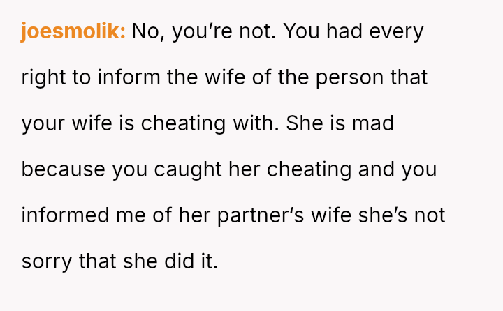 Given the breakdown of trust and the conflicting actions taken by both parties, the central question remains: Was the OP justified in exposing the affair to the other man's wife as a means of addressing the marital betrayal, or did this action overstep personal boundaries and escalate a private conflict inappropriately?