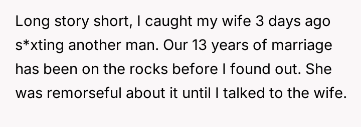 Betrayal cut deep when he discovered his wife of thirteen years secretly s*xting another man, shattering the fragile trust they had left.