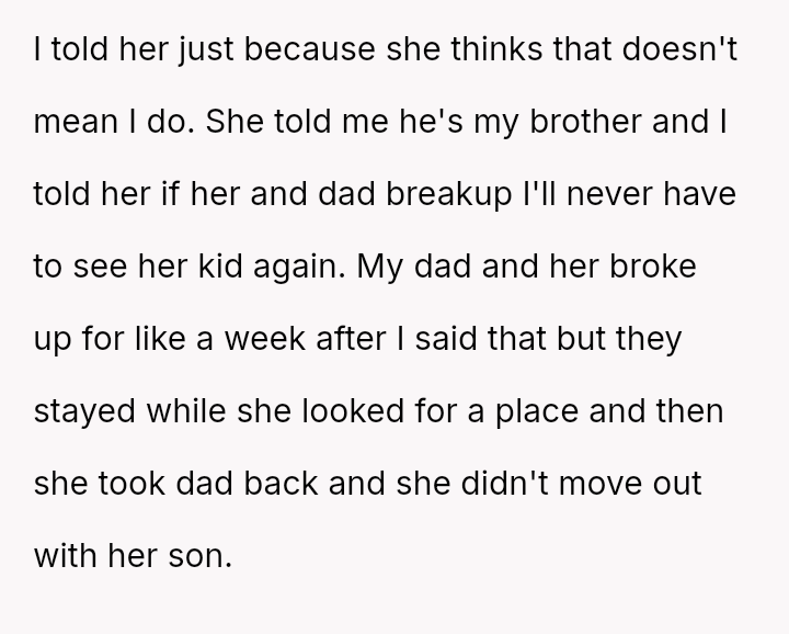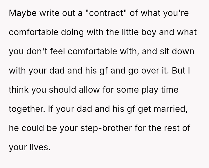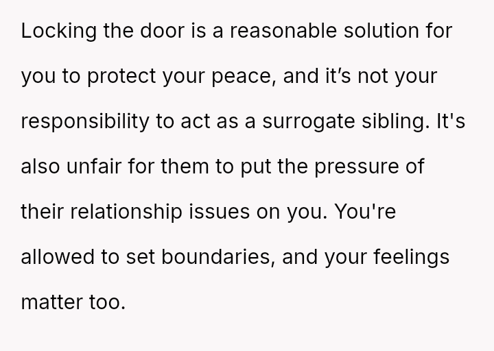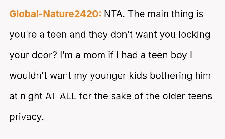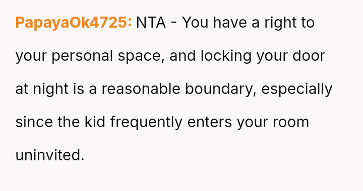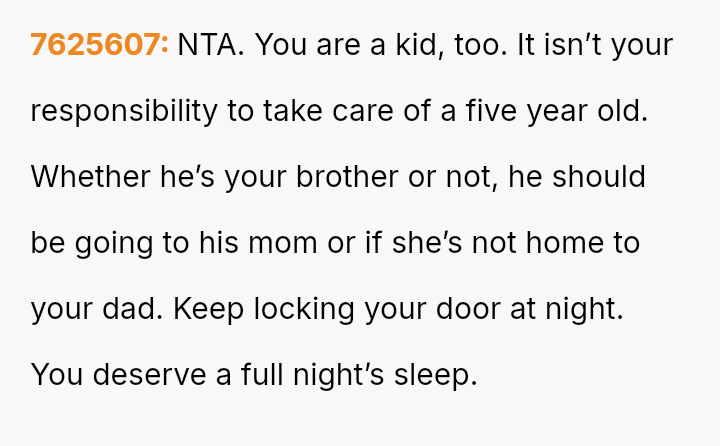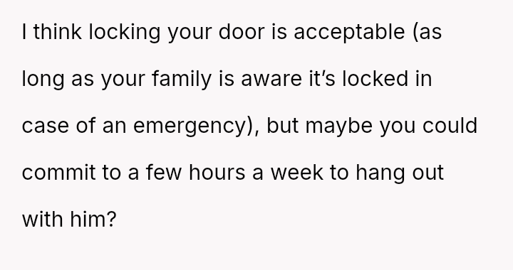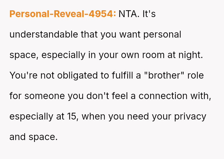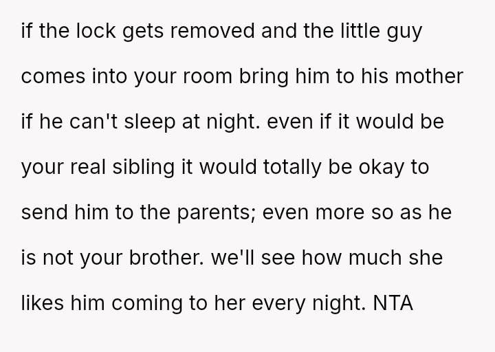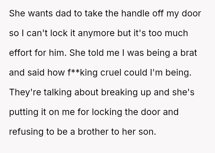 Given the escalation, where the OP's right to privacy is being challenged by the removal of their door lock and threats of further relationship dissolution, the core question remains: Is it an acceptable exercise of personal autonomy for a teenager to rigidly enforce boundaries against an unwanted caretaker role, or does the newly formed family dynamic necessitate prioritizing the emotional needs of the younger child, even at the expense of the OP's comfort?