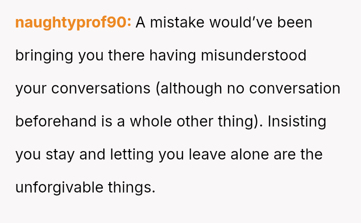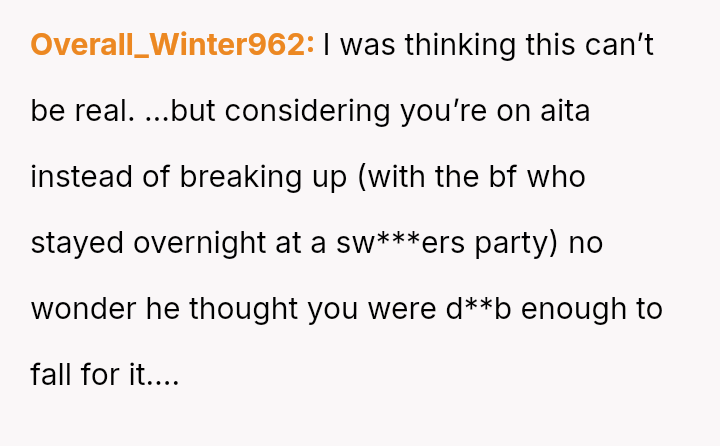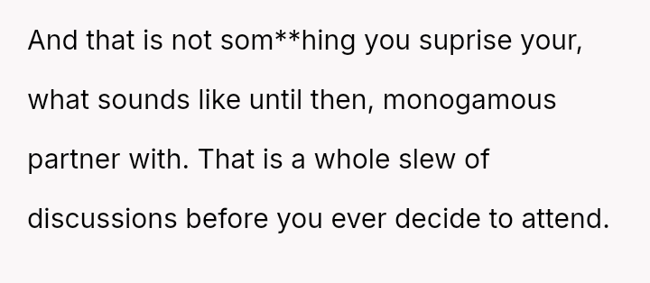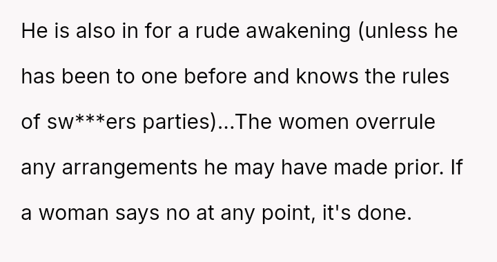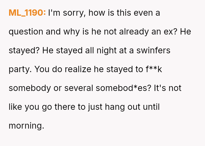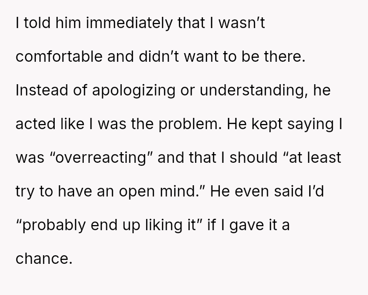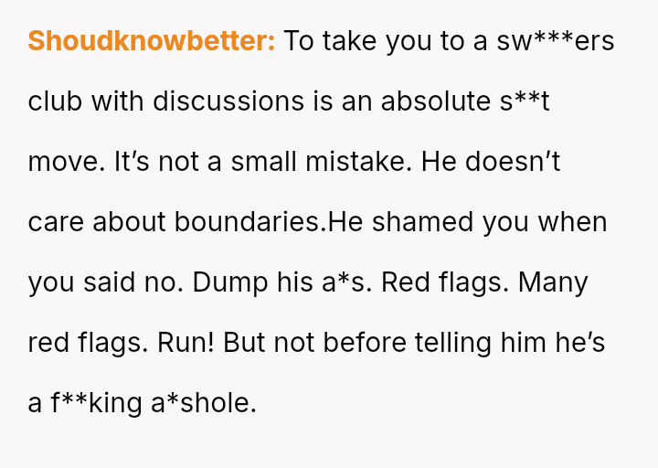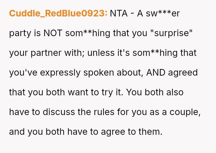 The original poster (OP) experienced a significant breach of trust when her boyfriend planned and took her to a sw***er party without her explicit consent, leading to feelings of shock, disrespect, and being blindsided.