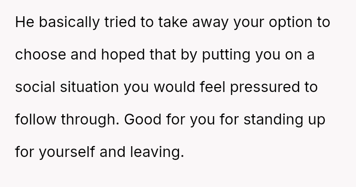 Her immediate action was to leave the situation, while the boyfriend continued to attend the event, creating a fundamental conflict between her need for safety and respect and his actions which disregarded her boundaries.