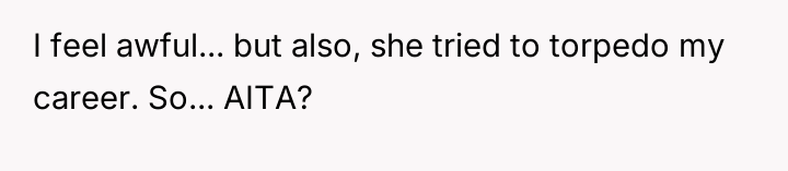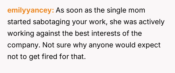 While the OP acted to protect their professional standing against malicious career interference, the knowledge that the terminated coworker is a single mother has introduced significant guilt and external judgment regarding the severity of the consequence.