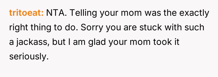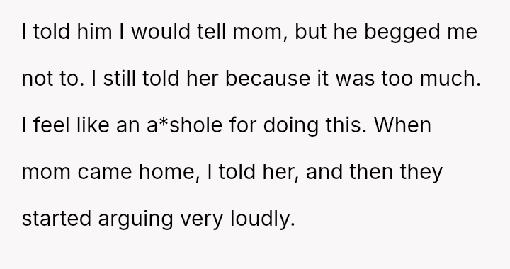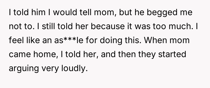 The core tension lies between the OP's justifiable reaction to a**se and the subsequent guilt felt over reporting the stepfather's words, which fractured the marital dynamic.