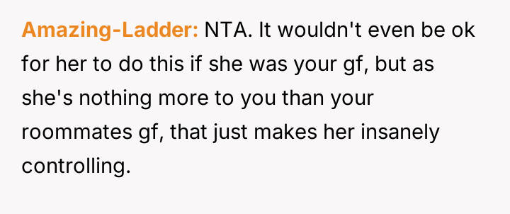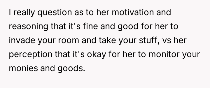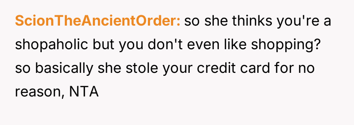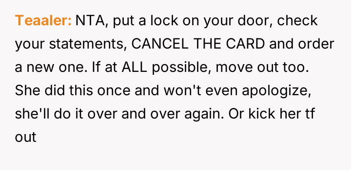 The original poster is dealing with a severe breach of trust and privacy after his roommate's girlfriend took his credit card based on her personal assessment of his spending habits.