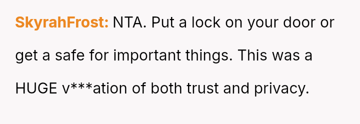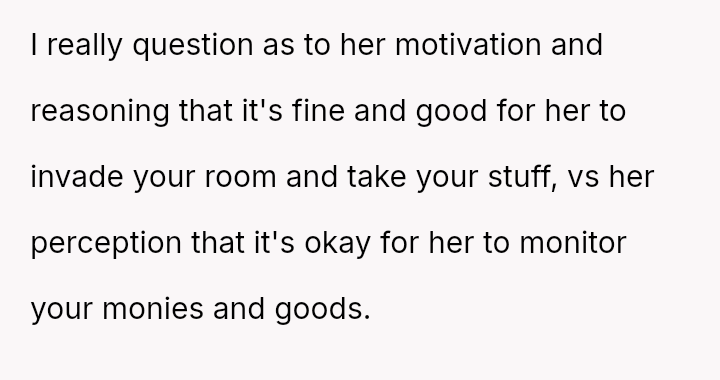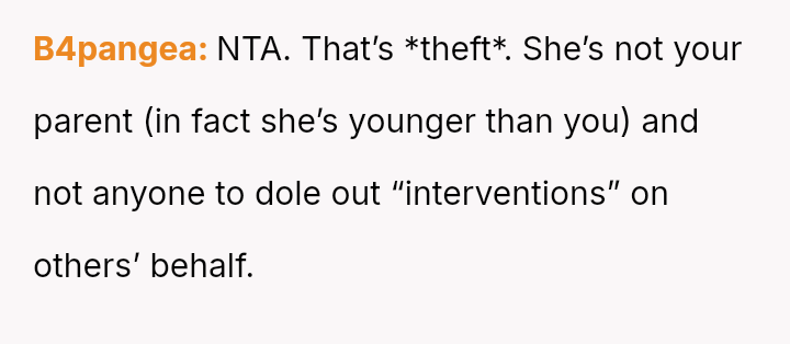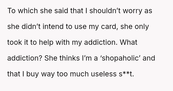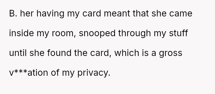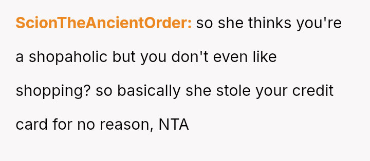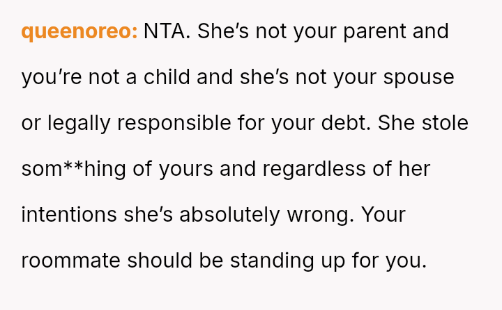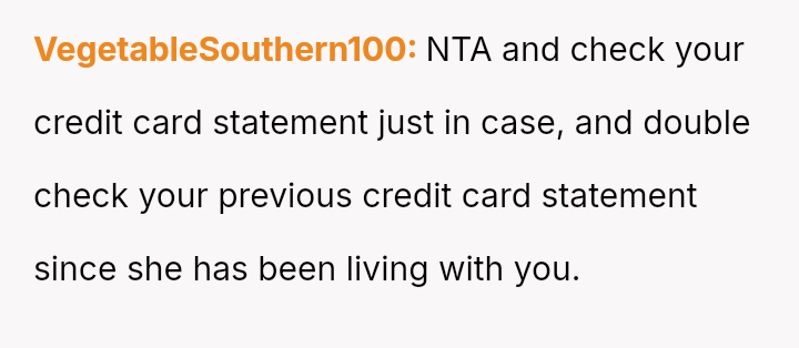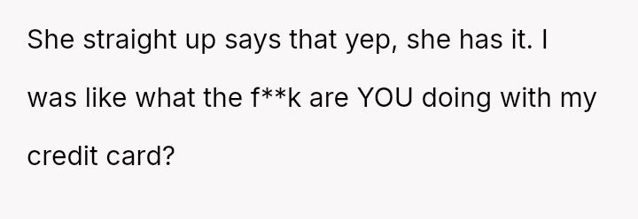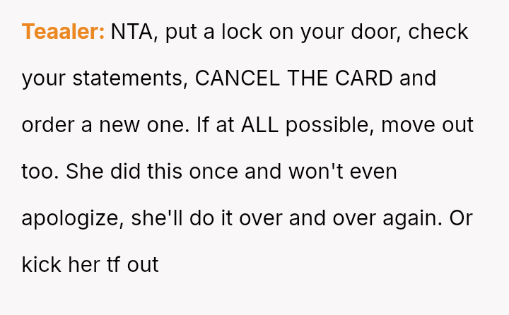 The original poster is dealing with a severe breach of trust and privacy after his roommate's girlfriend took his credit card based on her personal a*sessment of his spending habits.