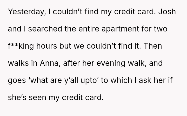 When Anna unexpectedly revealed she had taken the narrator’s credit card, claiming to protect him from a fabricated addiction, the fragile trust they had built shattered in an instant.