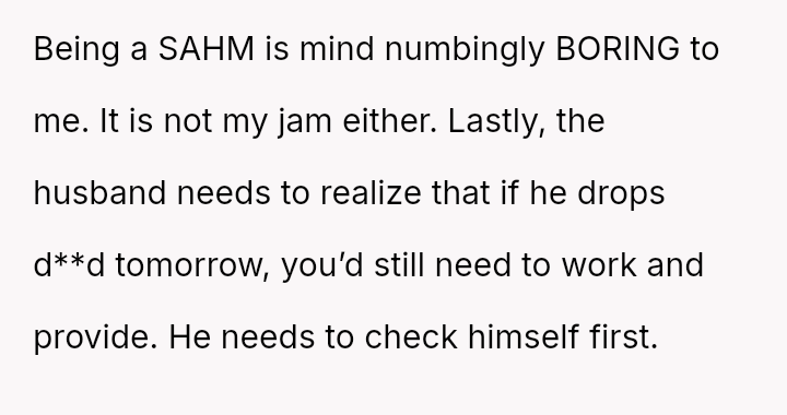 The original poster (OP) faces a significant conflict where her desire for personal fulfillment through work clashes directly with her husband's expectation that she should be a stay-at-home mother responsible for all domestic duties.