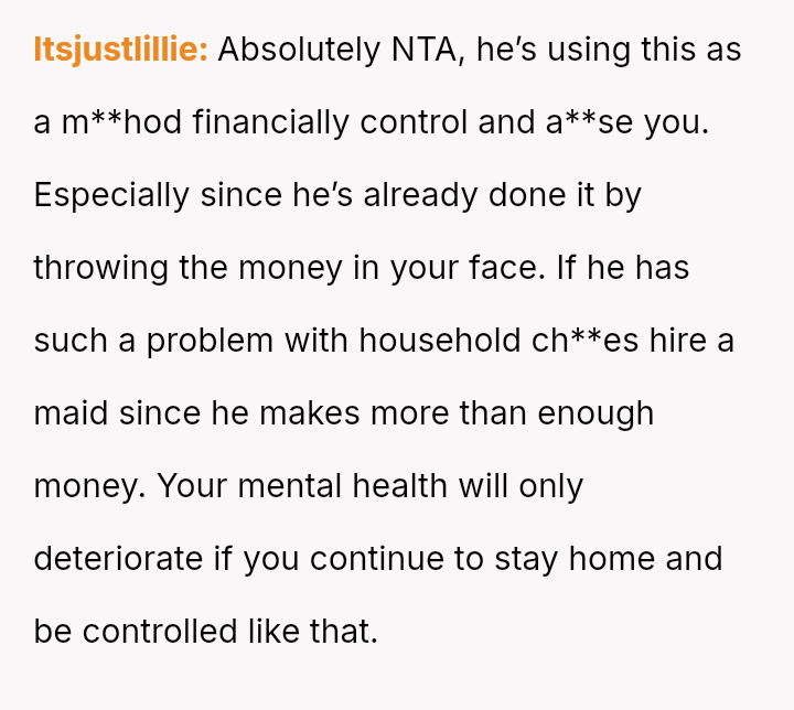 Is the OP justified in prioritizing her mental health and career aspirations over her husband's desire for a traditional home structure, especially given her past trauma regarding financial dependency, or is the husband’s expectation that she fulfill the role of a full-time homemaker reasonable within the context of their marriage?
