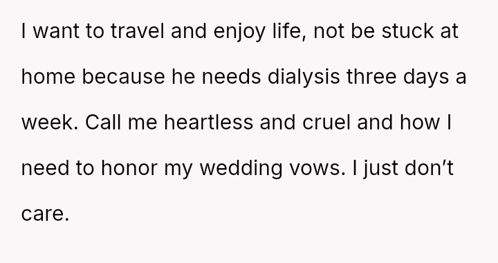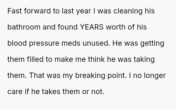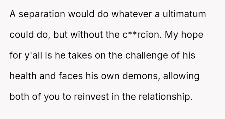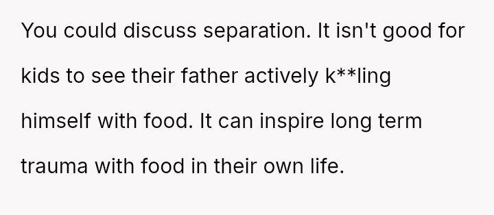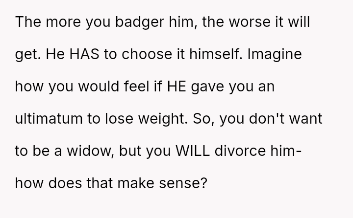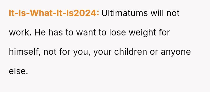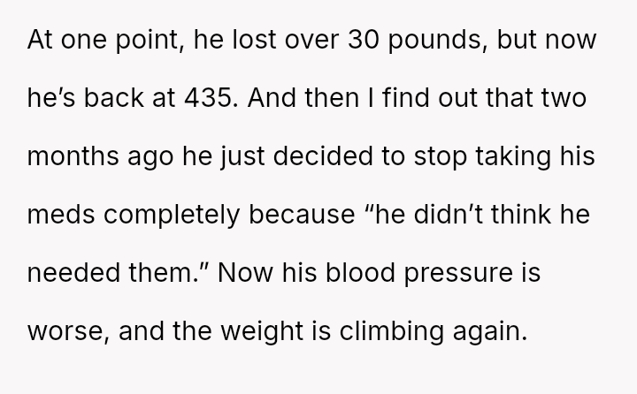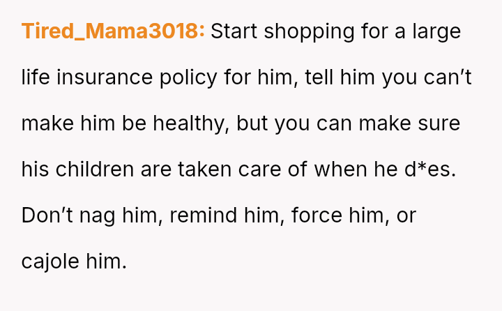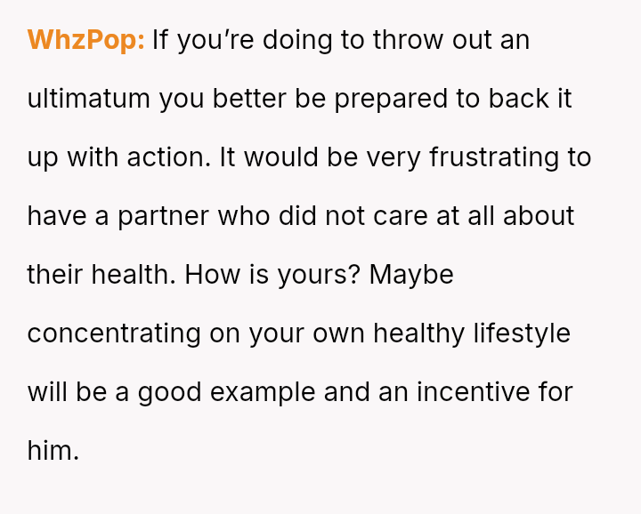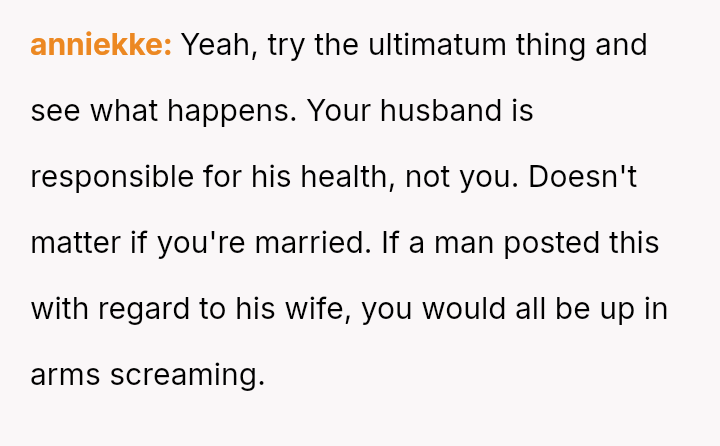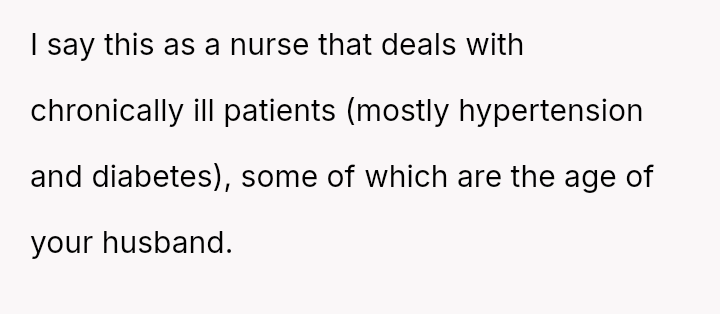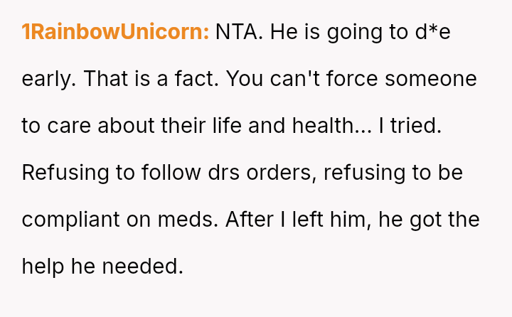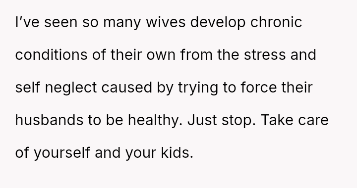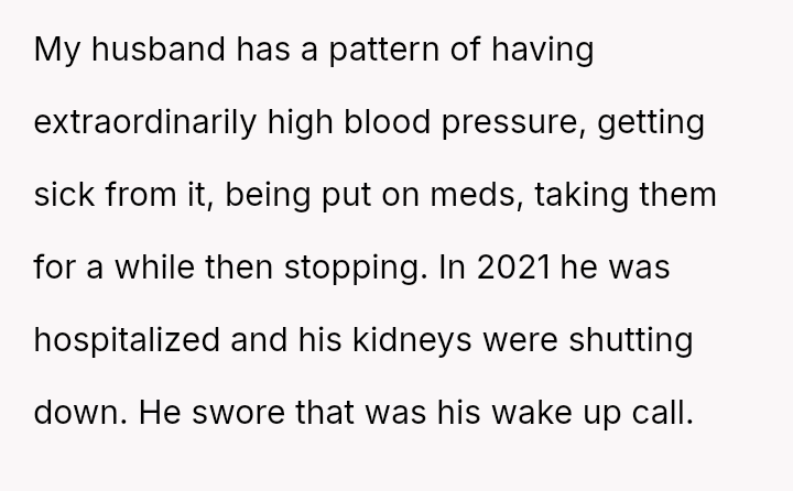 Given that the husband's refusal to manage his health directly endangers his future presence in the family, the central question is whether the OP is justified in issuing a strict ultimatum regarding his health compliance, or if setting such a boundary crosses into controlling behavior that could damage the relationship further.
