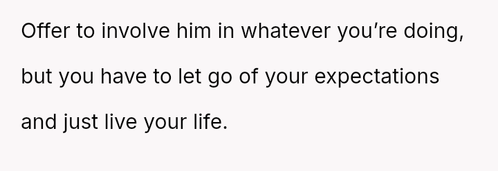 Her conflict centers on her inability to force him to take responsibility for his severe health issues, despite her efforts to support him with medication reminders, activity suggestions, and logistical help.