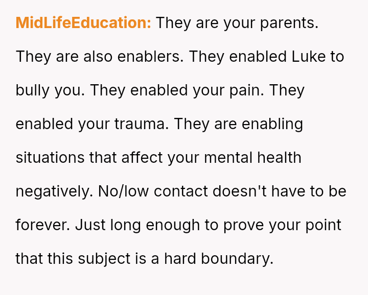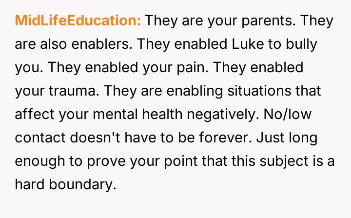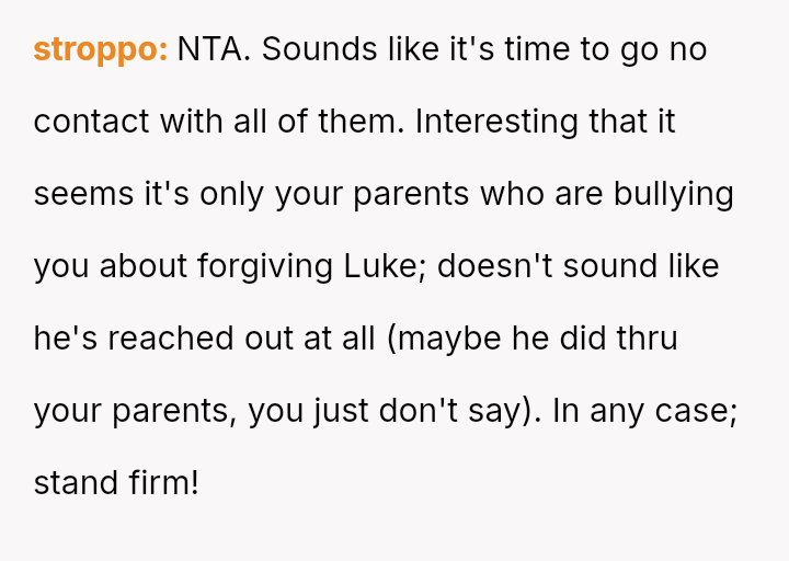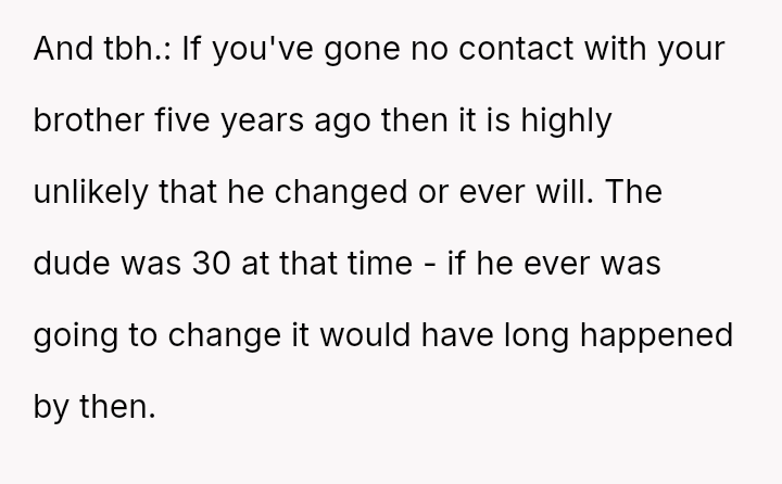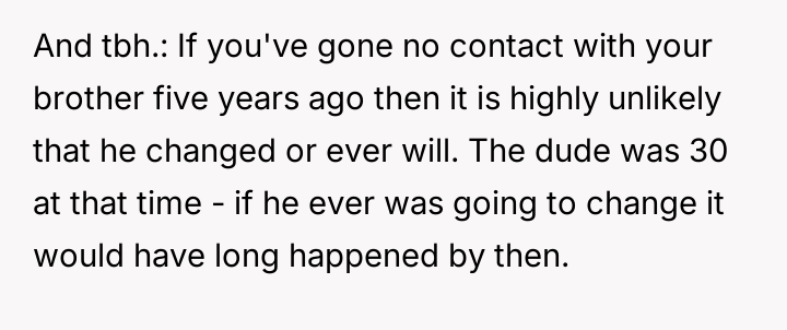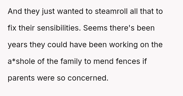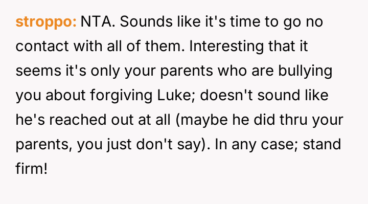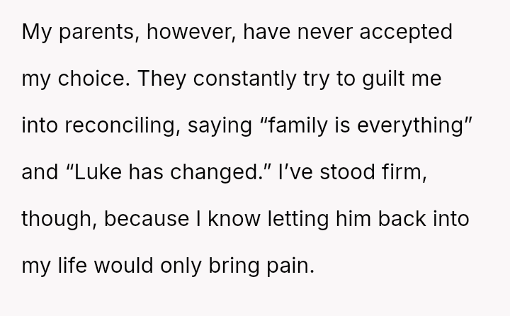 The central conflict involves the OP's firm decision to maintain no-contact with an abusive brother versus the parents' belief that family obligation overrides the OP's emotional safety and prior agreement.