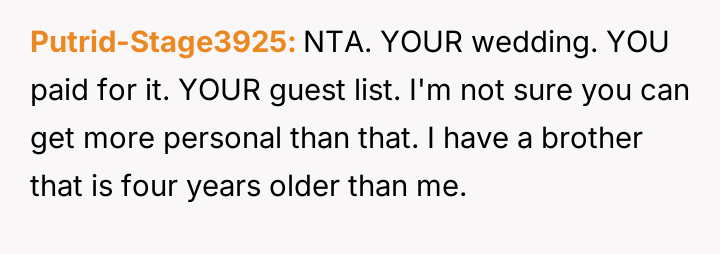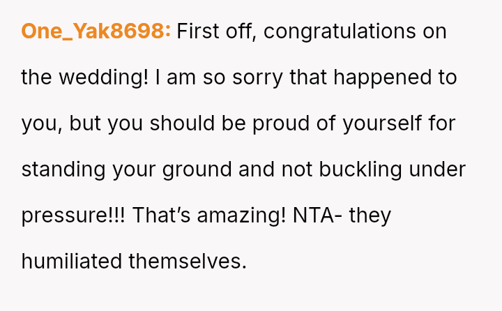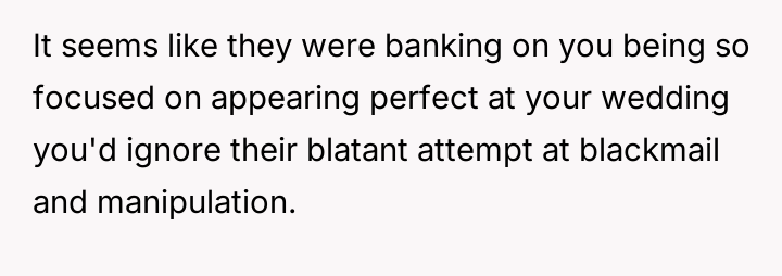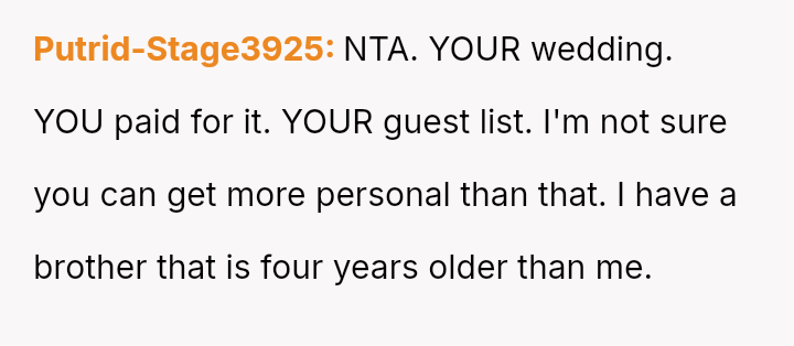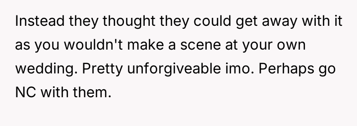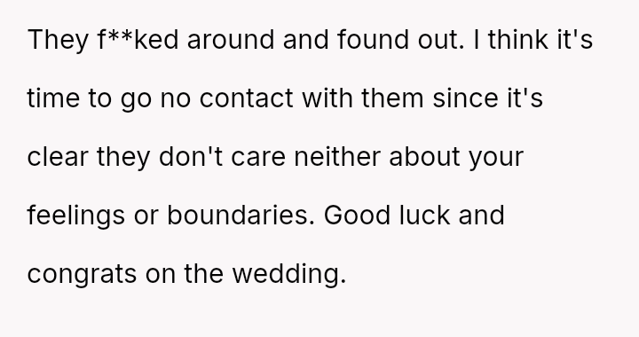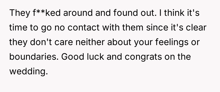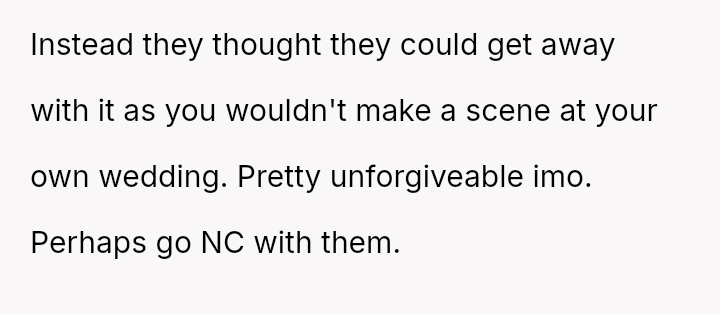 The original poster (OP) faced a significant v***ation of personal boundaries set for a major life event, the wedding.