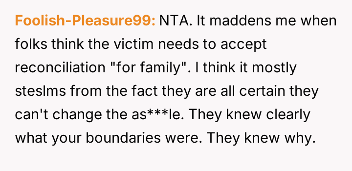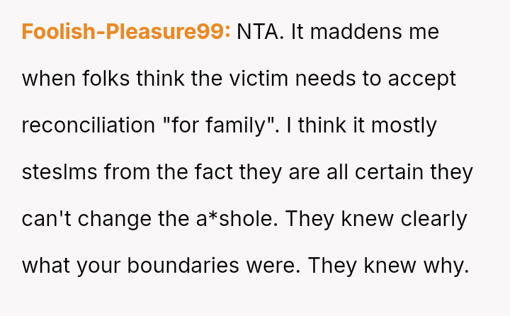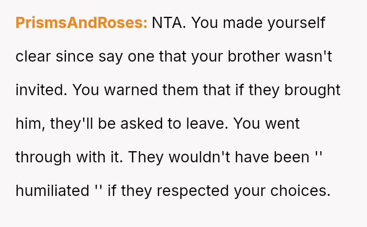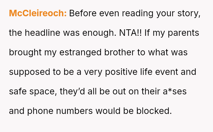 Given the clash between the OP's need for a safe, celebratory environment and the parents' insistence on including a known source of past trauma, was the OP justified in enforcing their boundary by asking their parents to leave, or should they have sacrificed their peace to maintain temporary family harmony?