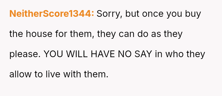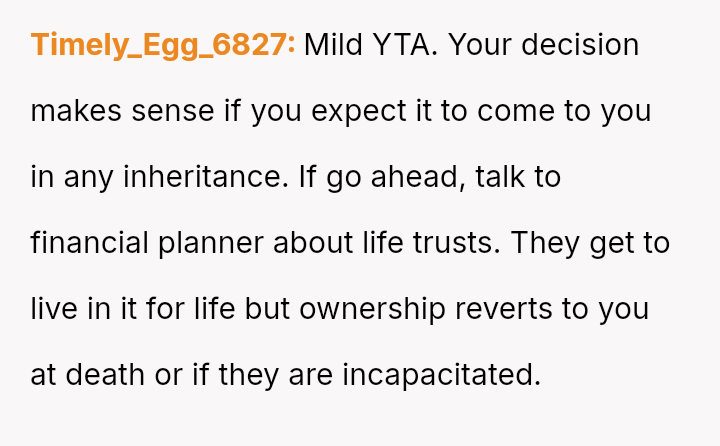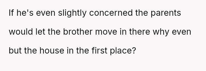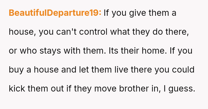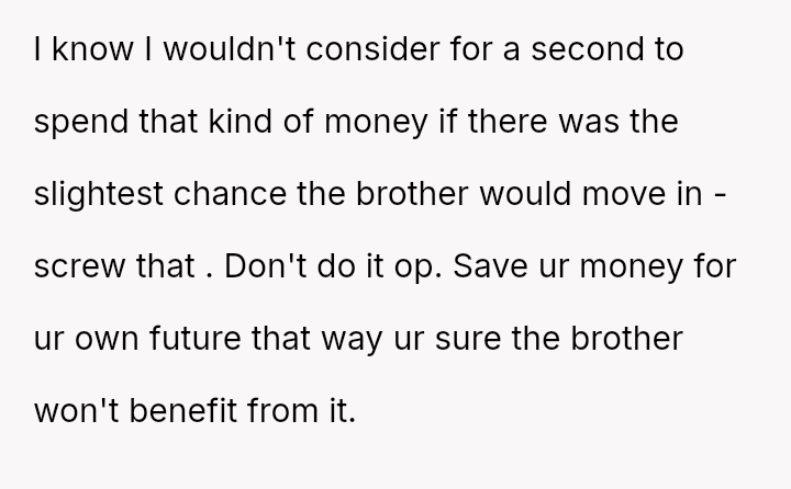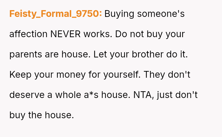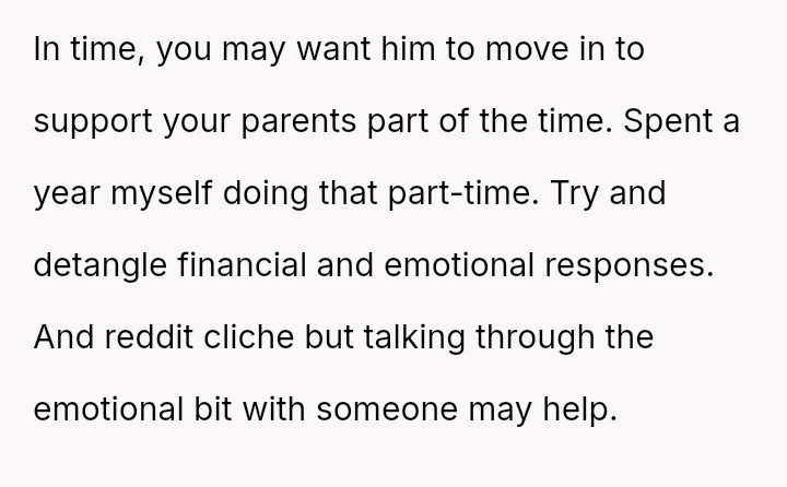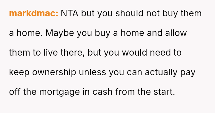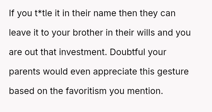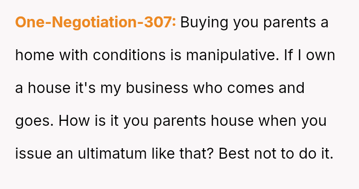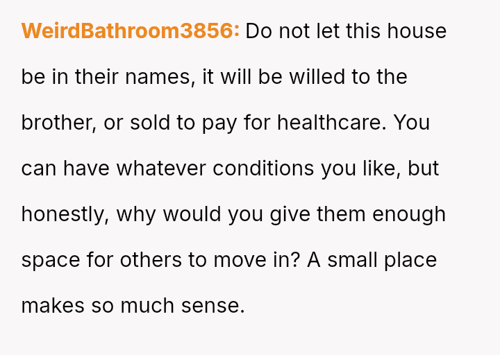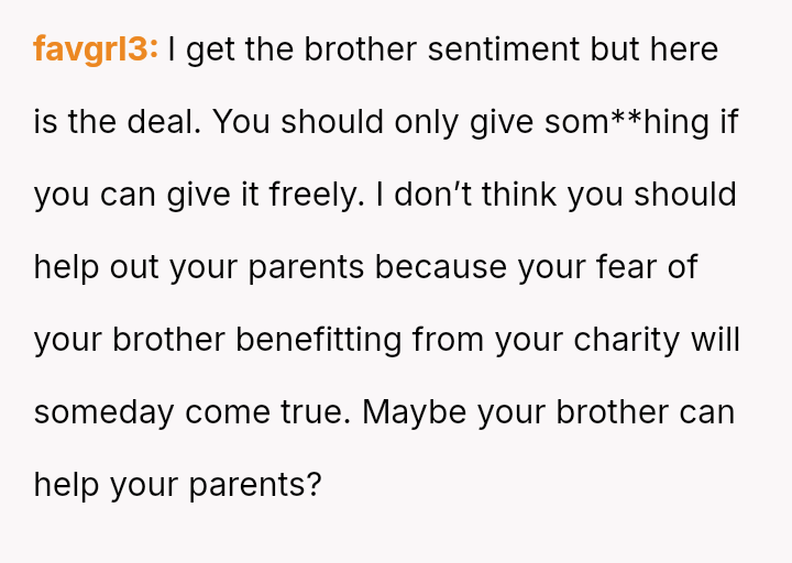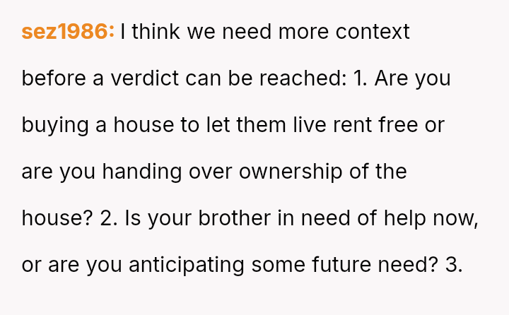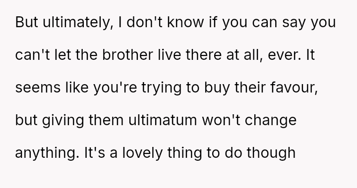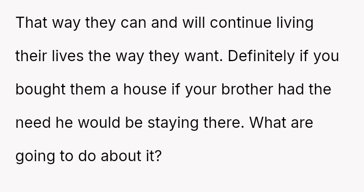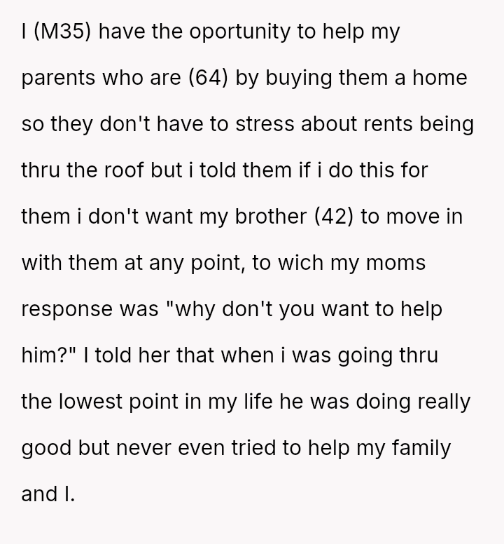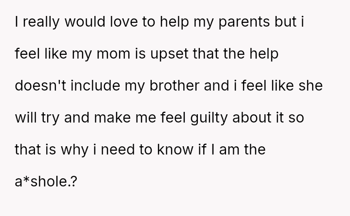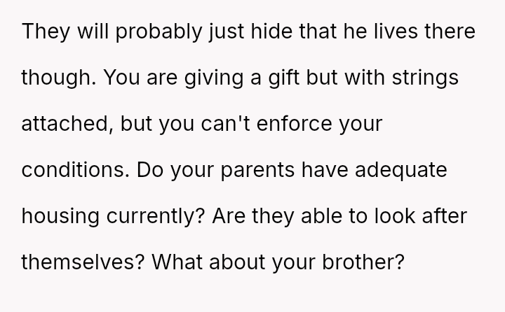 The original poster is caught in a difficult situation where his generous offer to secure housing for his parents is directly challenged by his mother's insistence that the aid must extend to his brother.