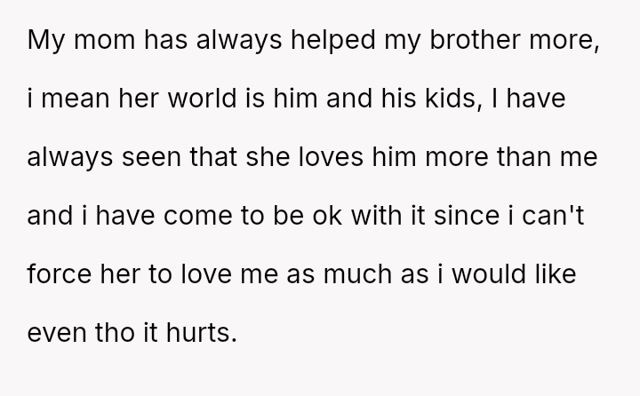 The scars of past neglect run deep, as the brother once prospered while the family struggled, and the mother's unwavering favoritism toward her son leaves the man feeling invisible and hurt.