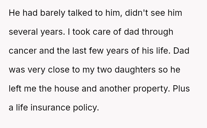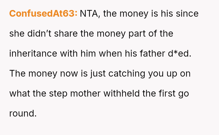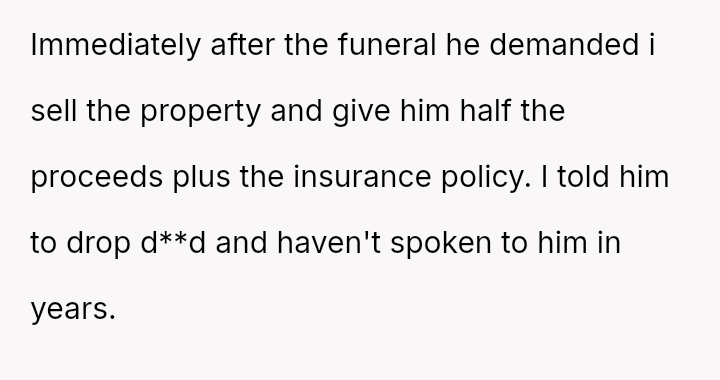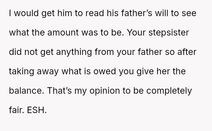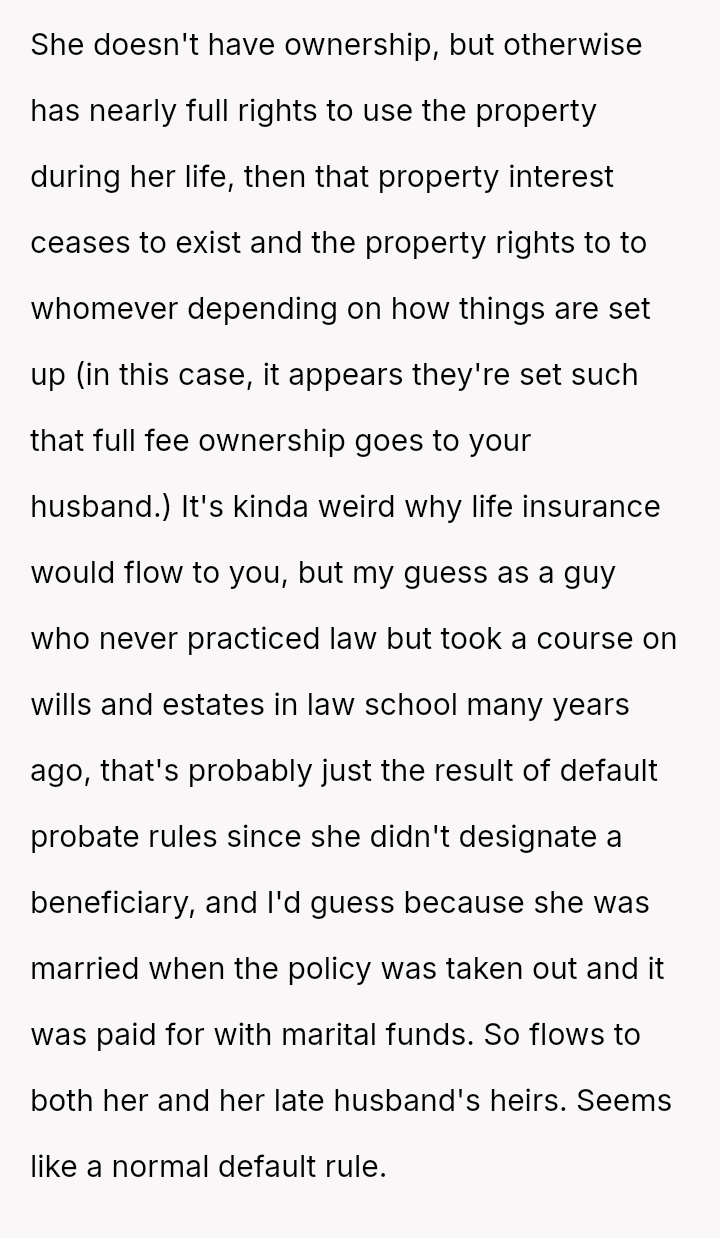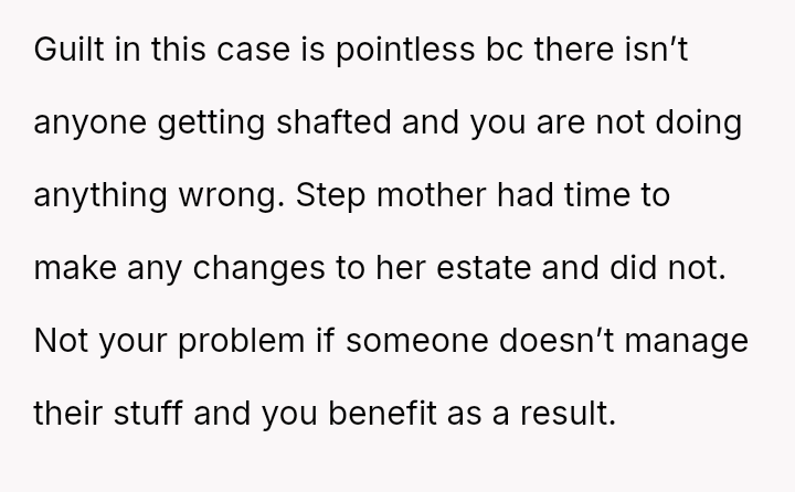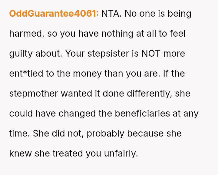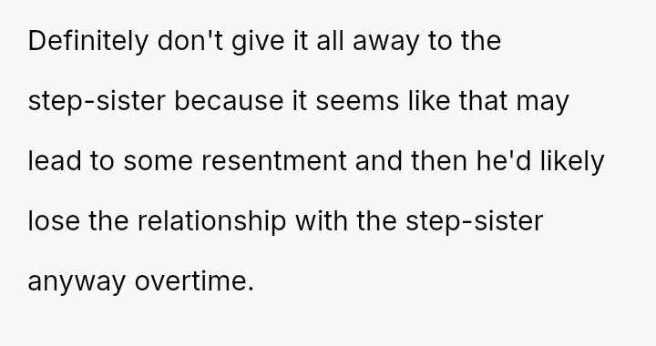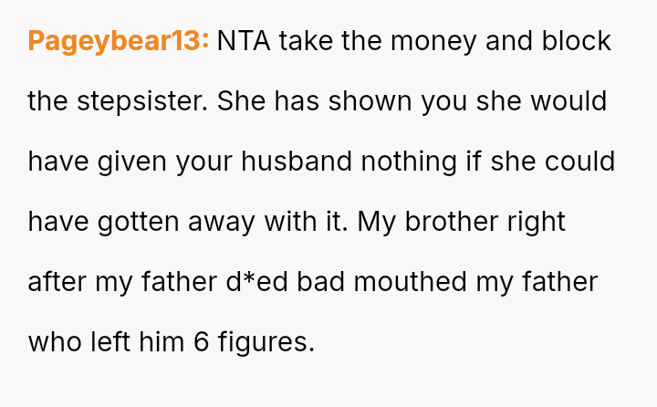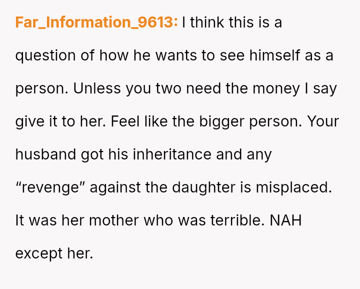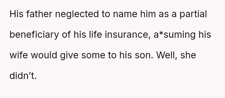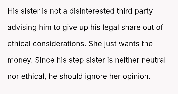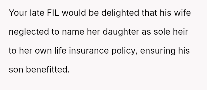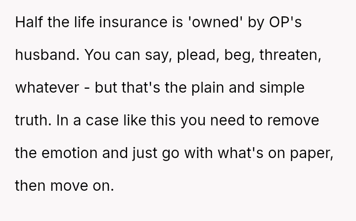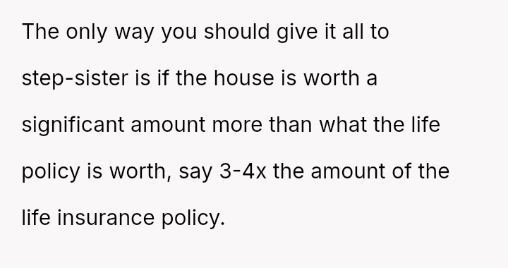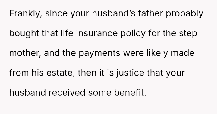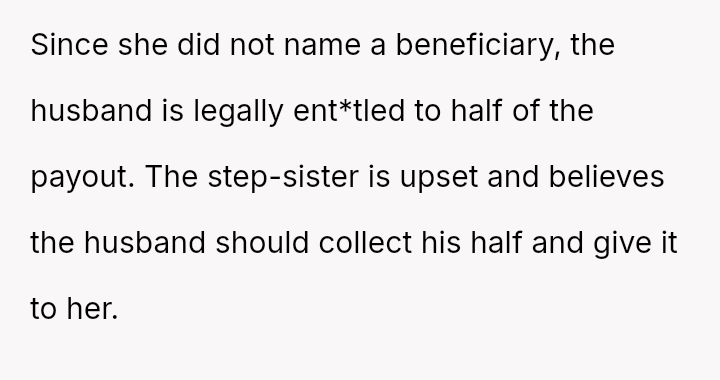 Given the history of exclusion and the stepmother's alleged failure to honor the spirit of his father's will regarding other a*sets, is the husband justified in retaining the insurance money that legally belongs to him, or would doing so be an unfair act toward the grieving step-sister who expects him to yield the funds?