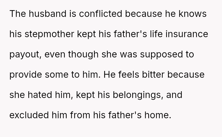 The husband is caught between a legal right to half of his late stepmother's insurance payout and a strong feeling of moral justification for keeping it, given the severe mistreatment he experienced from her for nearly three decades.