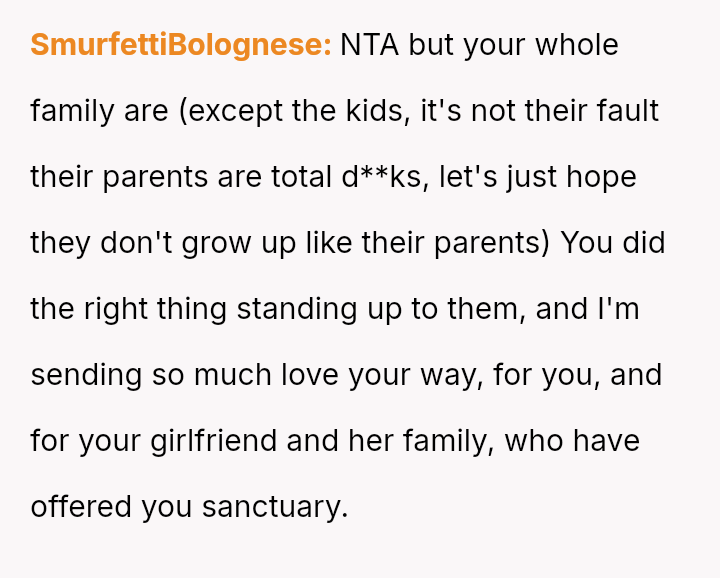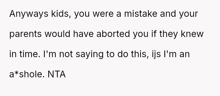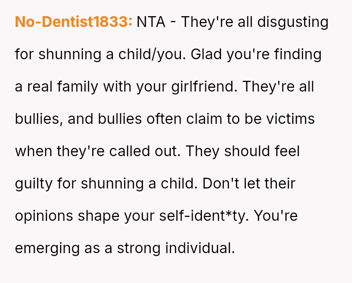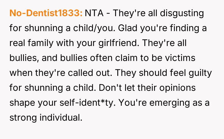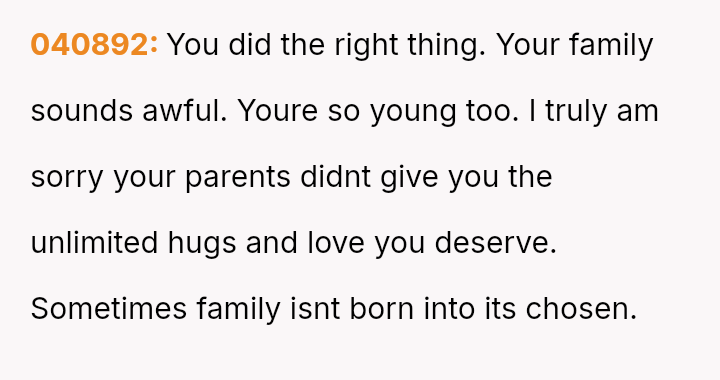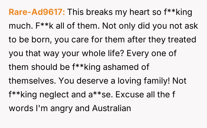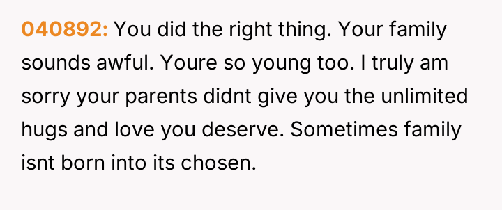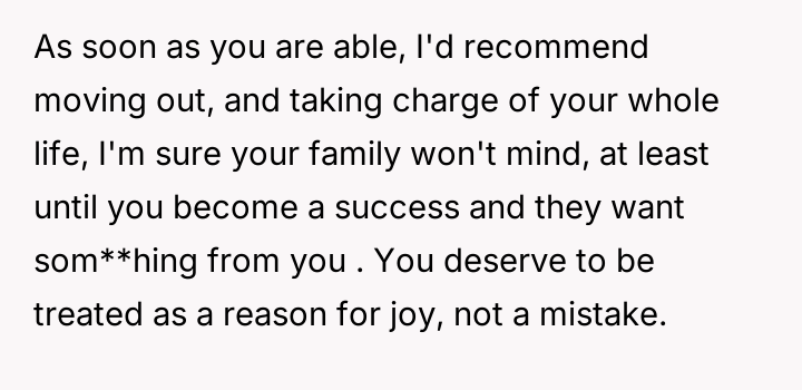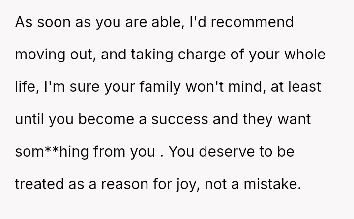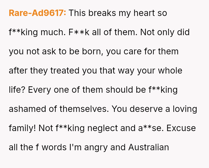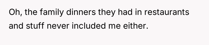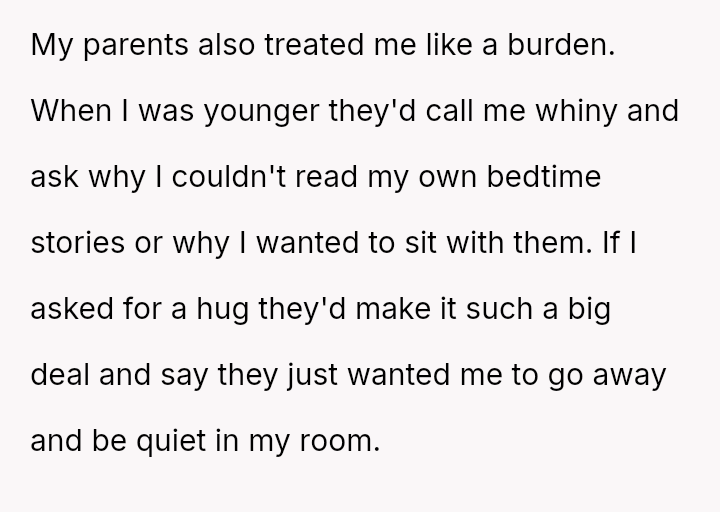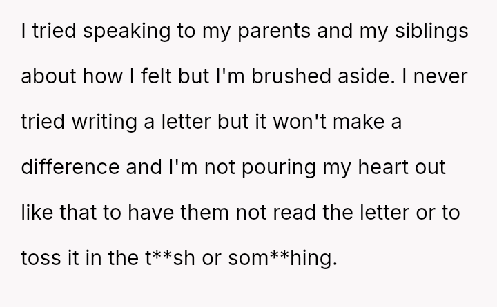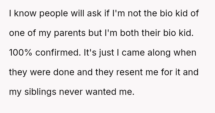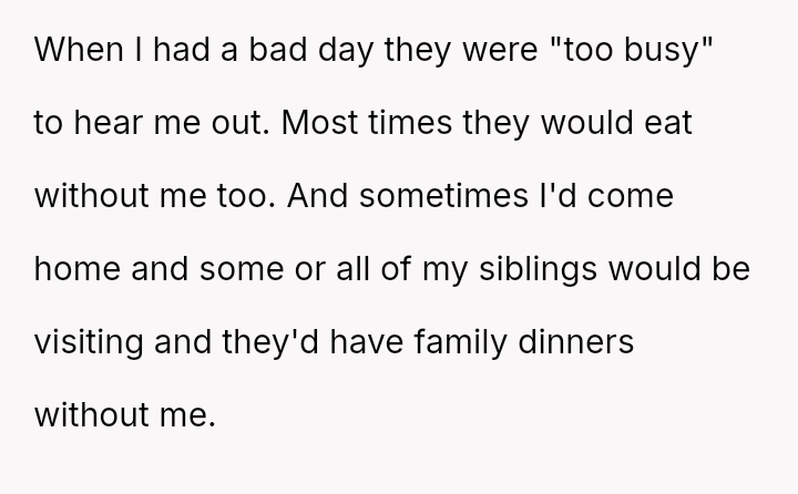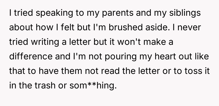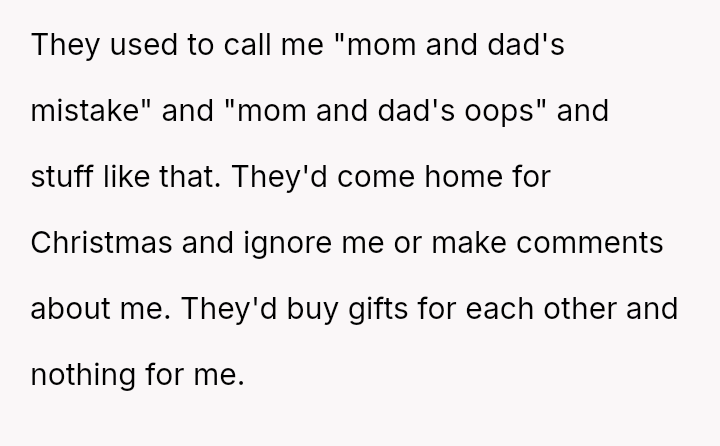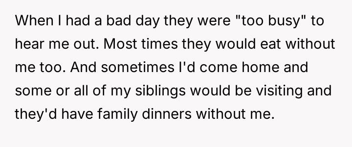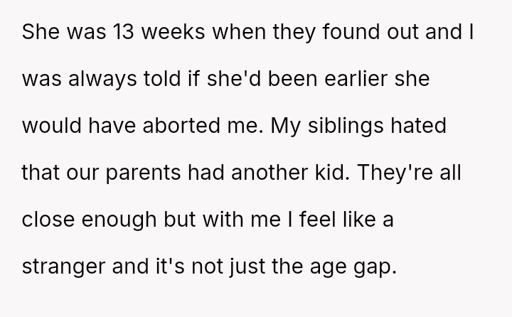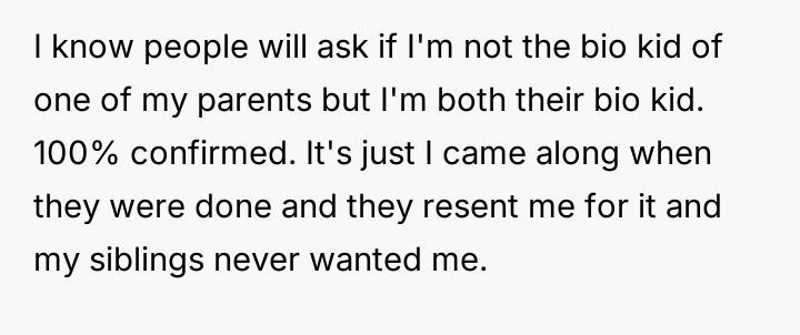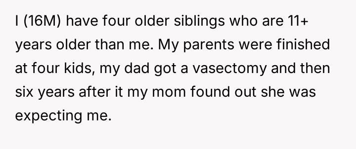 His four older siblings, who are all more than eleven years his senior, reportedly resented his arrival, sometimes calling him "mom and dad's mistake." The feeling of being an outsider extended to his parents, who the poster claims treated him like a burden, often dismissing his needs for attention or comfort when he was younger.