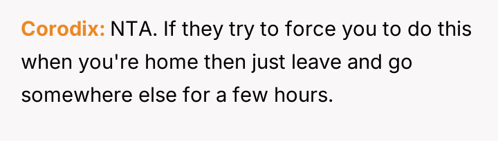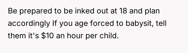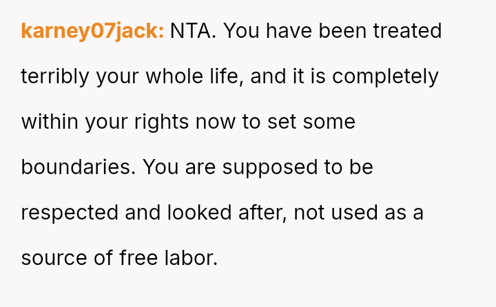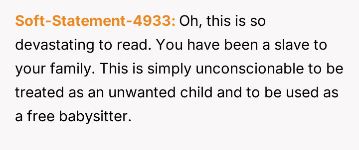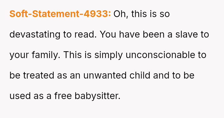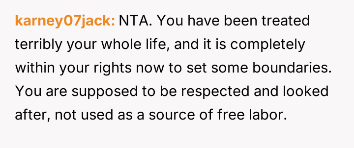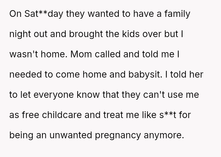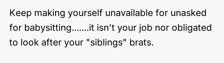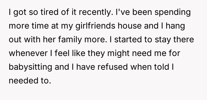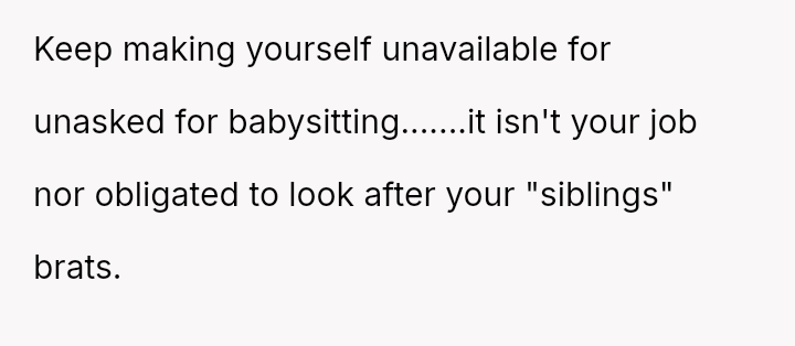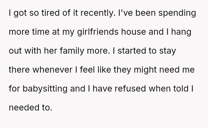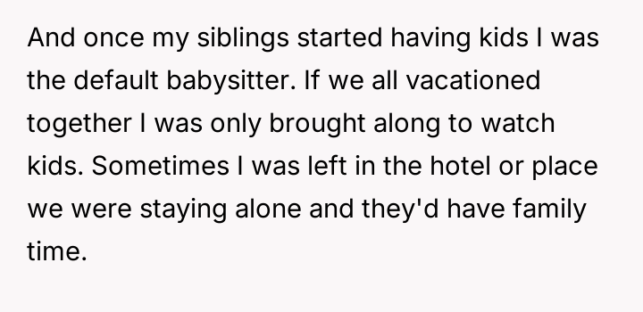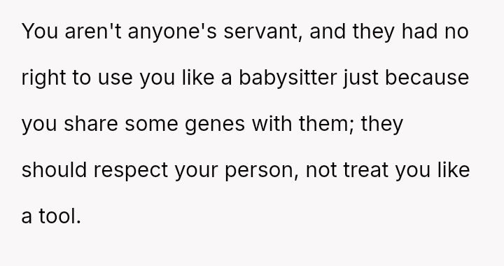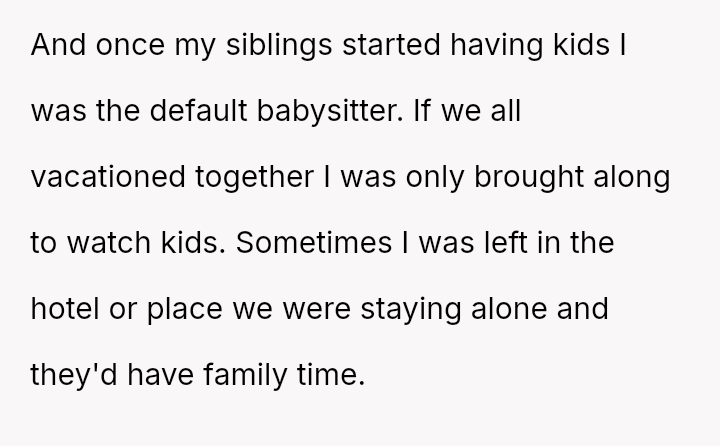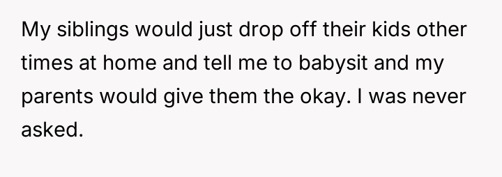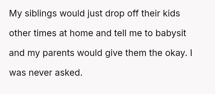 This pattern continued into his teenage years where he became the default, unpaid babysitter for his siblings' children, leading him to question his place and finally decide to set firm boundaries.