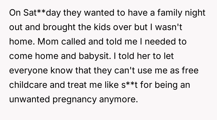 AITA for refusing to babysit for my siblings anymore and telling my family they can't use me as free childcare and treat me like s**t for being an unwanted pregnancy?