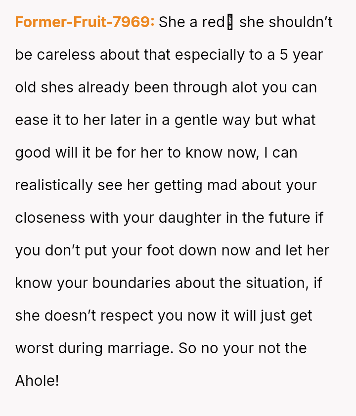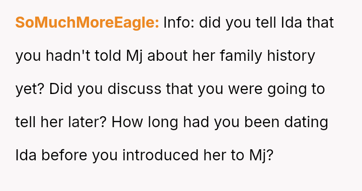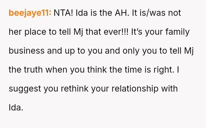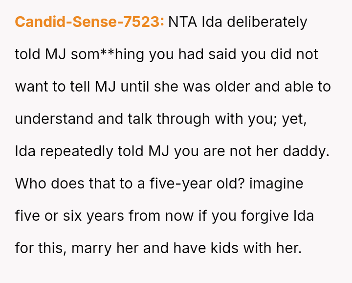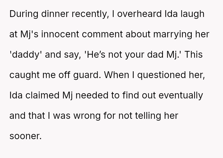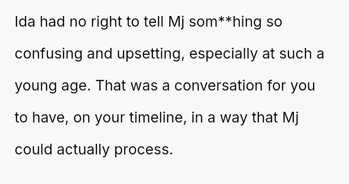 The core question remains whether Ida was justified in immediately clarifying the biological truth to a five-year-old, potentially fracturing the es**blished family unit, or if the OP was correct in prioritizing the child's emotional security and waiting for a more appropriate time to discuss the complex family history.