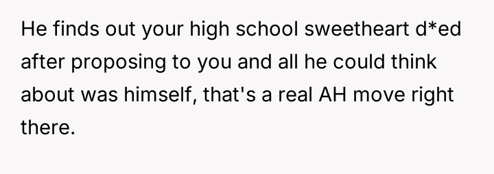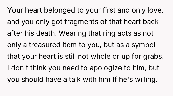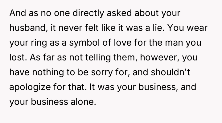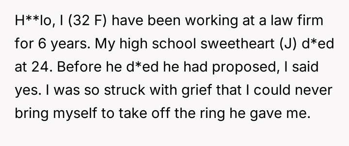 The original poster (OP) is dealing with the emotional weight of her deceased fiancé's ring, which she wears as a symbol of enduring grief and commitment, leading to a widespread, unspoken assumption among her colleagues that she is married.