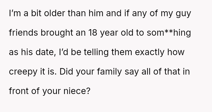 The poster reacted strongly by swearing and calling the relationship inappropriate, leading to accusations from the family that he ruined the celebration, leaving him questioning his reaction and concerned for his niece's future.