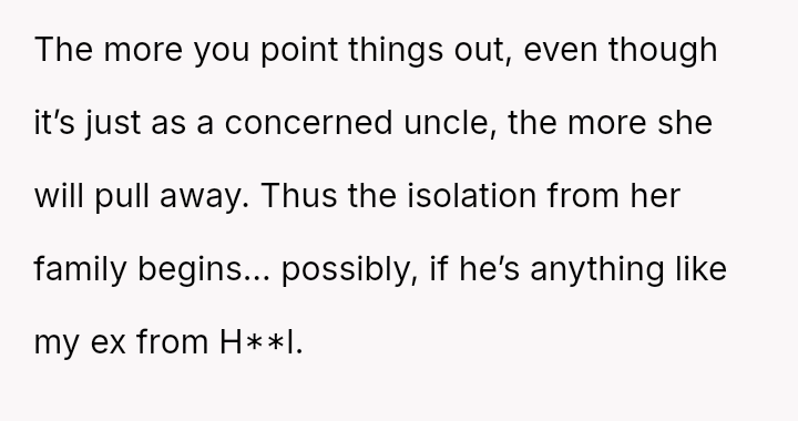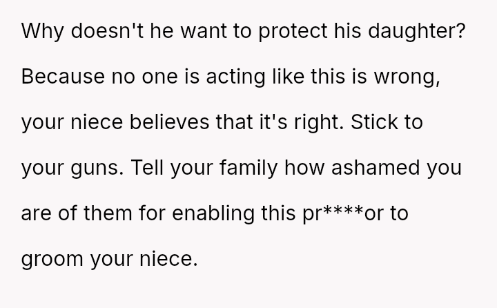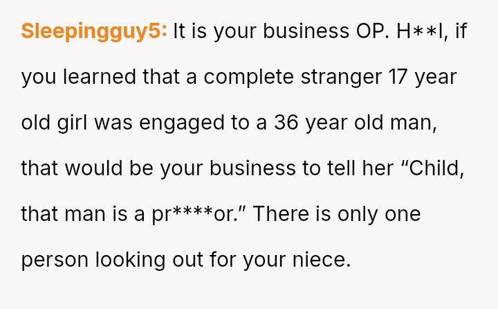The poster is experiencing significant emotional conflict stemming from his protective feelings toward his young niece and the strong disapproval he feels regarding her engagement to a much older man.